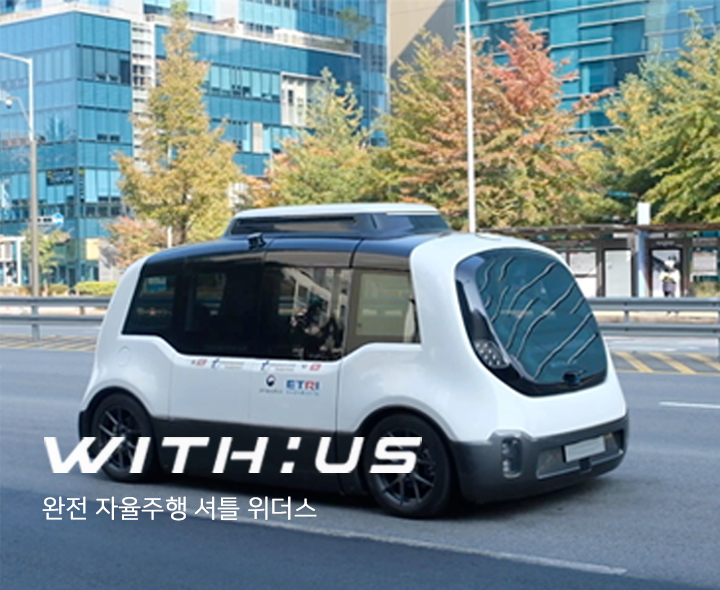 순수 국내 기술로 개발된 완전자율주행 셔틀 위더스는 운전석이 없는 실내 공간이 특징이며 운전자가 필요 없을 정도의 고도화된 자율주행 기술과 LTE/5G 통신 기술을 탑재하여 스스로 주변 상황을 인식하고 목적지까지 안전하게 이동할 수 있습니다.